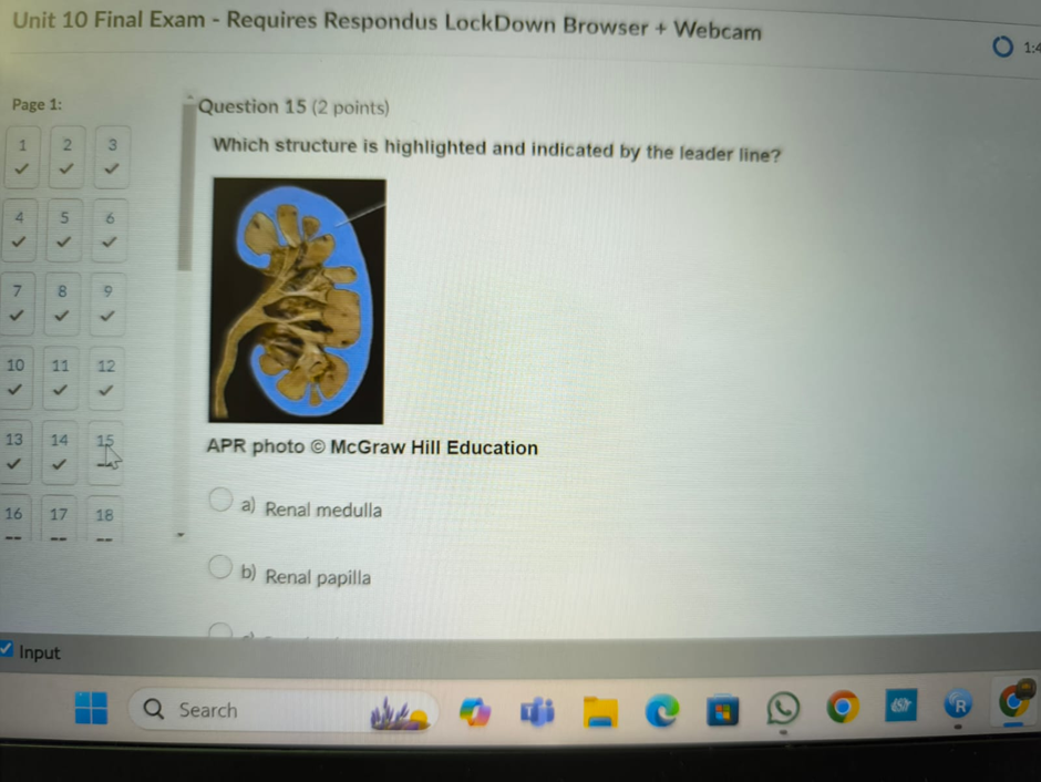 B. Renal papilla: The renal papilla is the tip of a renal pyramid where urine drains into the minor calyx. It is a small, localized structure.